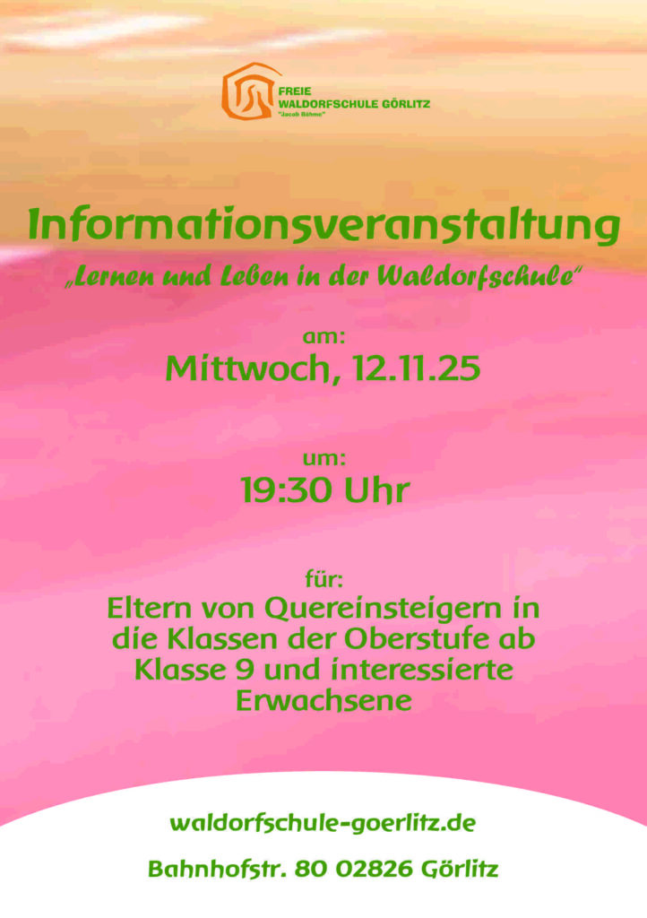Eltern von Quereinsteigern in die Oberstufe (ab Klasse 9) sind herzlich eingeladen zu dem Informationsabend am 12. November. Erfahren Sie etwas über die Waldorfschule, ihr Konzept und ihre Besonderheiten, das Aufnahmeverfahren und vieles mehr…