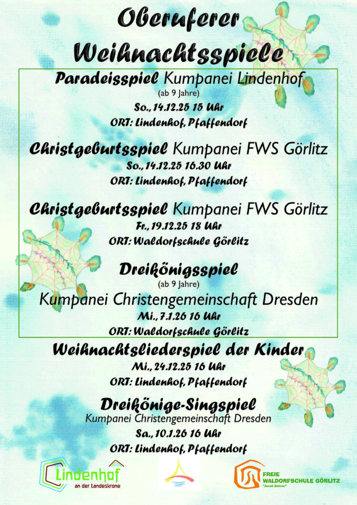 Jährlich in der Advents- und Weihnachtszeit zeigen die Kumpaneien des Lindenhofes, der Waldorfschule Görlitz und der Christengemeinschaft Dresden die Weihnachtsspiele, die aus drei Teilen – dem Paradei-Spiel (ab 9 Jahren), dem Christgeburt-Spiel und dem Dreikönig-Spiel (ab 9 Jahren) beginnen am Lindenhof in Pfaffendorf und in der Waldorfschule in Görlitz. Die Kumpaneien zeigen die Stücke als Schüleraufführungen und öffentlichen Aufführungen.
